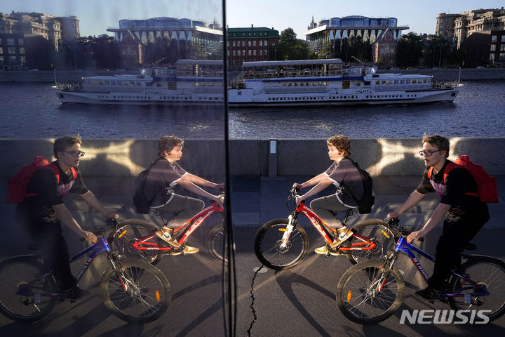 [모스크바=AP/뉴시스] 22일(현지시각) 러시아 모스크바에서 청소년들이 따뜻한 날씨 속 자전거를 타고 모스크바강 제방을 따라 이동하는 모습이 금속 큐브에 비치고 있다. 모스크바는 23도의 쾌청하고 온화한 날씨를 보이고 있다. 2024.05.23.