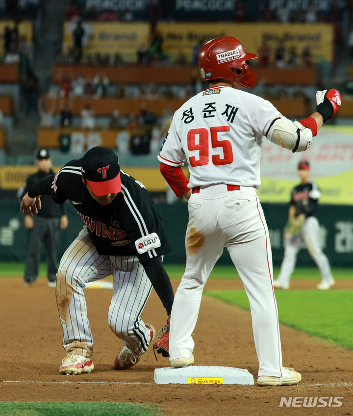 [인천=뉴시스] 고범준 기자 = 30일 오후 인천 미추홀구 SSG랜더스필드에서 열린 2024 KBO리그 LG 트윈스와 SSG 랜더스의 경기, 7회말 1사 SSG 정준재가 3루타를 치고 세레머니를 하고 있다. 2024.05.30. [email protected]