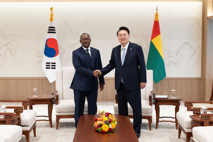 [서울=뉴시스] 윤석열 대통령이 3일 서울 용산 대통령실 청사에서 열린 한-기니비사우 정상회담에서 우마로 시소쿠 엠발로 기니비사우 대통령과 악수하며 기념촬영 하고 있다. (사진=대통령실 제공) 2024.06.03. [email protected] *재판매 및 DB 금지
