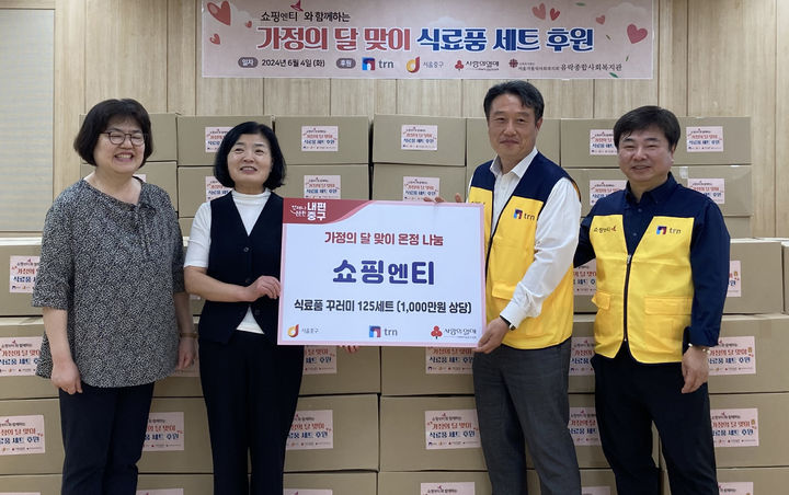 [서울=뉴시스] 데이터홈쇼핑사 쇼핑엔티(법인명 티알엔)는 4일 서울 중구 유락종합사회복지관에 저소득 아동과 독거 어르신 가정에 즉석식품,과일과 임직원들의 손편지로 구성된 나눔꾸러미 125세트를 기부했다. 왼쪽부터 정선희 유락복지관장, 이춘배 중구청 복지정책과장, 강부곤 쇼핑엔티 경영지원실장, 조태홍 쇼핑엔티 MC사업부장. (사진=쇼핑엔티 제공) 2024.06.05. [email protected] *재판매 및 DB 금지