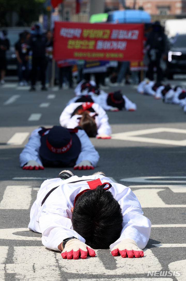 [서울=뉴시스] 이영환 기자 = 5일 오전 서울 중구 락앤락 본사 앞에서 열린 부당해고 철회! 원직복직 이행! 경영정상화 촉구! 기자회견을 마친 화섬식품노조 수도권지부 및 락앤락지회 조합원들이 오체투지를 하고 있다.  2024.06.05. [email protected]