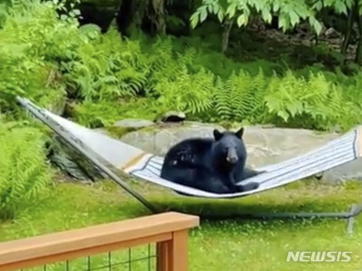 [웨이츠필드=AP/뉴시스] 노아 드웩이 제공한 영상 캡처 사진에 지난 11일(현지시각) 미 버몬트주 웨이츠필드 자택 뒷마당에 침입한 흑곰 한 마리가 해먹에 앉아 여유를 즐기고 있다. 드웩은 어린 곰 두 마리가 집으로 들어와 그중 한 마리가 해먹에 앉아 있었다면서 "사랑스럽고 재미있는 광경이었다"라고 말했다. 그는 영상 촬영 후 곰들을 쫓아냈다고 전했다. 2024.06.13.