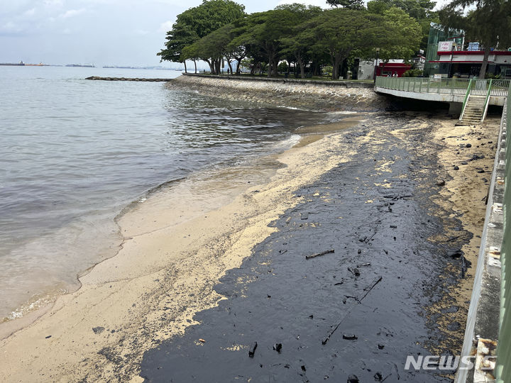 [싱가포르=AP/뉴시스] 18일(현지시각) 싱가포르 이스트코스트 파크 해변이 유출된 기름으로 오염돼 있다. 지난 14일 네덜란드 선박 '복스 막시마'가 기관 고장으로 표류 중 싱가포르 유조선 '마린 아너'와 부딪혀 저유황유가 유출, 센토사섬, 래브라도 자연보호구역 등까지 밀려들면서 해당 구역이 폐쇄됐다. 현지 당국은 400톤의 기름이 유출된 것으로 보고 있다. 2024.06.18.