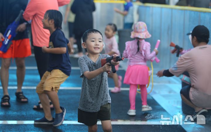 [청주=뉴시스] 서주영 기자 = 17일 오후 충북개발공사 주차장에서 열린 '문화의바다 열음콘서트'에서 한 아이가 물총을 쏘며 행사를 즐기고 있다. 2024.08.17. [email protected]