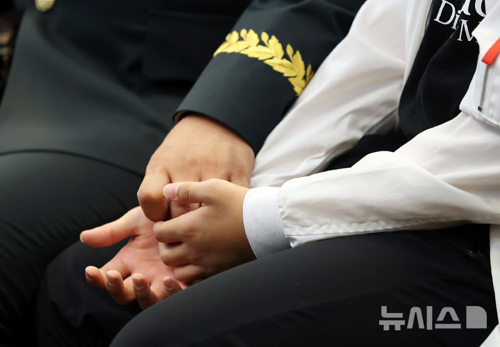 [서울=뉴시스] 김명년 기자 = 27일 오전 서울 용산구 국방컨벤션에서 열린 제1회 군인가족의 날 기념식에서 한 군인이 아들의 손을 잡고 있다. 2024.09.27. [email protected]