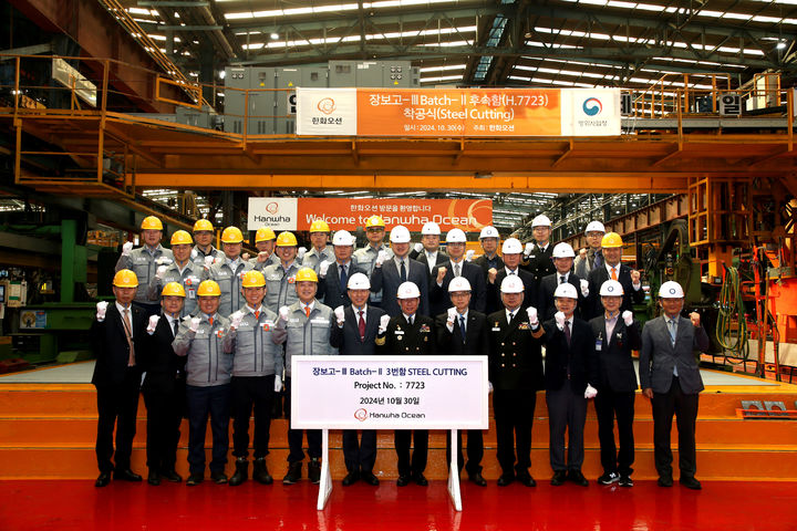[서울=뉴시스] 김진아 기자 = 30일 경남 거제 한화오션 조선소에서 열린 장보고-III Batch-II 3번함 착공식에서 이상우 방위사업청 한국형잠수함사업단장과 강정호 잠수함사령관(해군소장)을 비롯한 참석자들이 기념촬영을 하고 있다. (사진=방위사업청 제공) 2024.10.30 [email protected] *재판매 및 DB 금지