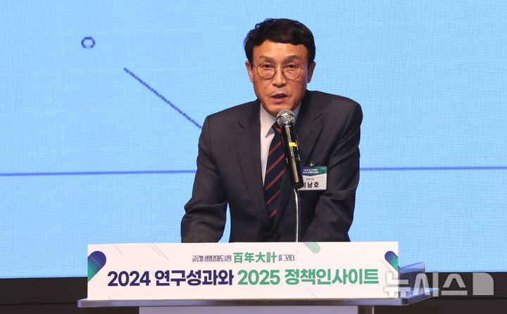 [전주=뉴시스] 김얼 기자 = 이남호 전북연구원장이 26일 전북 전주시 전주대학교에서 열린 전북연구원 연구성과 공유회에 참석해 인사말을 하고 있다. 2025.02.26. [email protected]