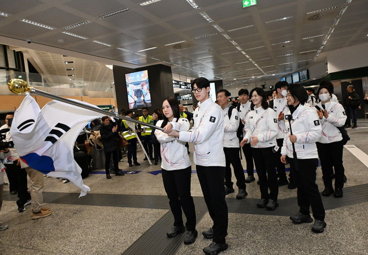 [서울=뉴시스] 김근수 기자 = 대한민국 선수단 기수 스피드스케이팅 박지우와 쇼트트랙 이준서가 30일(현지 시간) 이탈리아 밀라노 말펜사 공항으로 2026 밀라노 코르티나 담페초 동계올림픽에 출전하는 본진 선수들과 함께 태극기를 들고 입국하고 있다. (사진 = 대한체육회 제공) 2026.01.31. [email protected]