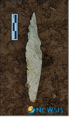 이와 함께 그동안 보고되지 않은 새로운 종류의 구석기시대 찌르개(112×17×13㎜) 1점도 수습했다. 몸체는 돌날로 만든 것으로 추정된다. 위의 끝 부위를 톱니처럼 만들고 등면의 중간쯤에서 굽쪽으로 남아있는 모서리는 얕은 잔손질로 가지런한 능선을 이루게 했다.