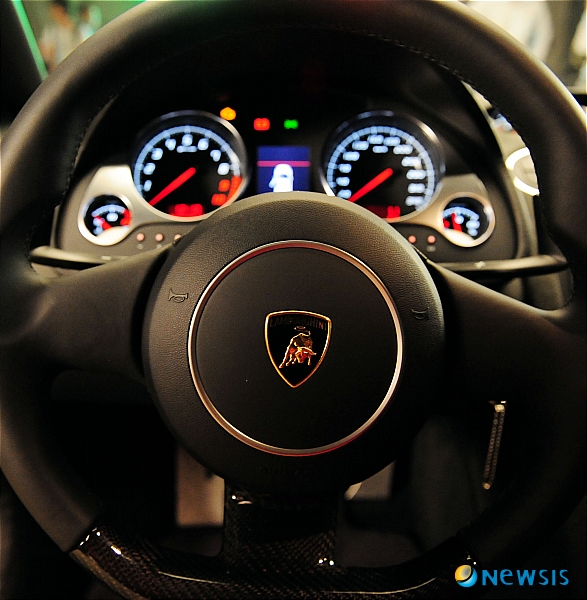 【서울=뉴시스】박동욱 기자 = 14일 오전 서울 논현동 인터와이어드스튜디오에서 열린 슈퍼카 브랜드 람보르기니가 신차 발표회에서 가야르도 라인업의 스페셜 모델인 가야르도 LP550-2 트리콜로레(Tricolore)를 선보이고 있다. 가야르도 LP550-2 트리콜로레는 이탈리아 통일 150주년을 기념해 제작된 스페셜 에디션이며, 국내 판매가격은 부가세 포함 3억 2,000만원대이다. 사진은 가야르도 LP550-2 트리콜로레의 핸들 모습.