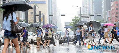 【서울=뉴시스】김인철 기자 = 더위 대신 장맛비가 내리고 있는 초복인 14일 오후 서울 강남구 교보타워 주변에서 시민들이 비를 피해 발걸음을 재촉하고 있다.