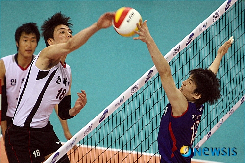 【영광=뉴시스】서재훈 기자 = 17일 전남 영광군 스포티움에서 열린 2011 삼성화재배 전국대학배구 종합선수권대회 남자대학부 A조 인하대-명지대 경기에서 인하대 박현빈의 공격을 명지대 김민제가 블로킹하고 있다. (사진=스포츠포커스 제공)