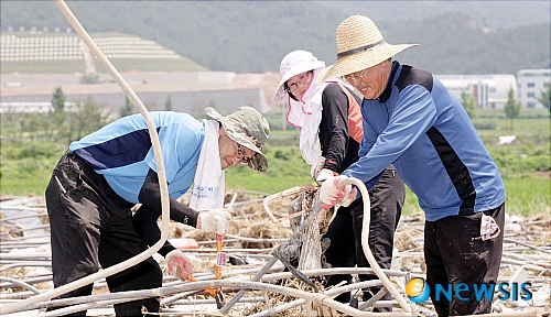 【밀양=뉴시스】안지율 기자 = 17일 지난 집중호우로 물 폭탄을 맞은 경남 밀양시가 피해지역 신속한 복구를 위해 주말 휴일을 반납한 전 공무원이 부북면 청운리 비닐하우스 피해 현장 복구 작업에 구슬땀을 흘리고 있다. (사진=밀양시 제공)