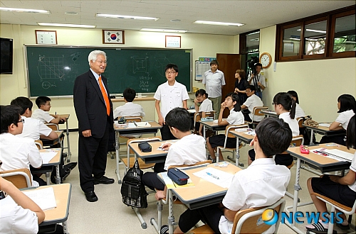 【광양=뉴시스】김석훈 기자 = 18일 전남 광양시 광양제철중학교에서 이상희 전 과기부장관(현 국립과천과학관 관장)을 비롯한 국립과천과학관 연구원, 수학전문가 등 10여 명이 수학 수업을 참관하고 있다. 이들은 포스코교육재단의 체계적이고 창의적인 선진 수학교육을 참관하기 위해 재단 산하 광양지역 학교를 방문했다. (사진=광양제철소 제공)