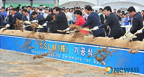 【대구=뉴시스】박세연 기자 = 19일 오전 대구시 달성구 성서산업단지에서 열린 SSLM기공식에 참석한 최지성(왼쪽 여섯번째부터) 삼성전자 부회장, 박근혜 전 대표, 김범일 대구시장, 유승민 한나라당 최고위원을 비롯한 주요 참석자들이 기념 시삽을 하고 있다.