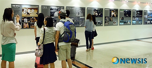 【부산=뉴시스】 하경민 기자 = 부산 롯데호텔은 호텔 레스토랑 새단장 공사로 인해 생긴 벽면에 미술작품 등을 전시하는 갤러리로 조성했다. 20일 오전 호텔 로비에 조성된 갤러리에서 고객들이 '1953~54년 컬러사진으로 본 부산'이라는 사진전을 관람하고 있다.