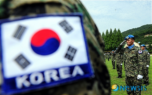 【인천=뉴시스】서재훈 기자 = 21일 오후 인천 계양구 소재 국제 평화지원단 연병장에서 동명부대 9진 장병 359명의 환송식이 열린 가운데 파병장병들이 국민의례를 하고 있다.