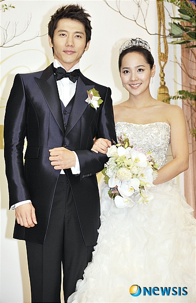 【안양=뉴시스】박문호 기자 = 23일 오전 경기 안양 관양동 서울중앙교회에서 웨딩마치를 올리는 가수 유진(오른쪽)과 탤런트 기태영이 결혼식에 앞서 기자들에게 포즈를 취하고 있다. 2009년 mbc드라마 '인연만들기'에서 인연을 맺은 이 커플은 같은 교회를 다니며 교제한지 1년 반만에 웨딩마치를 올린다.