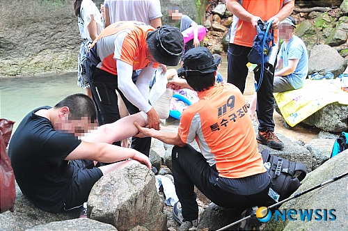 【서울=뉴시스】서울소방재난본부 119특수구조대는 지난 23일 낮 13:30분께 노원구 소재 수락산 물개바위 부근 수락계곡에서 친구들과 물놀이 중 바위에서 계곡으로 다이빙을 시도하다 두 다리를(양쪽 발목 염좌추정) 접질린 김모씨 (21세,남)를 현장에서 응급처치 후 산악구조용 들것을 이용하여 안전하게 하산, 대기중이던 구급대에 인계 이송했다. (사진=서울119특수구조대 제공)