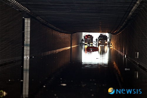 【화성=뉴시스】강종민 기자 = 집중호우가 퍼부은 27일 경기 화성 1번 국도 상의 병점지하차도가 침수돼 소방대원과 화성시 관계자들이 물빼기 작업을 하고 있다. 병점지하차도 침수로 양방향 통행이 극심한 정체를 빚었다.