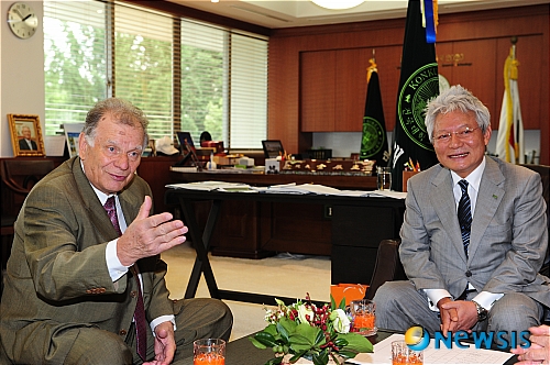 【서울=뉴시스】11일 오후 건국대학교 행정관에서 김진규(오른쪽) 건국대학교 총장과 조레스 알표로프 러시아 상트페테르부르크 과학센터장 겸 본교 석학교수(2000년 노벨물리학상)가 만나 글로벌 연구협력 방안을 논의하고 있다. (사진=건국대학교 제공)