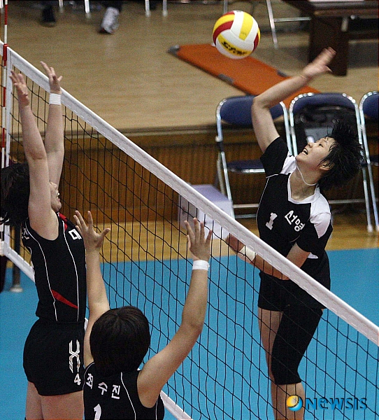 【강진=뉴시스】박동욱 기자 = 5일 전남 강진 동초등학교에서 열린 제22회 CBS배 전국 남녀 중고배구대회 여자고등부 진주선명여고와 대구여고의 경기에서 진주선명여고 신연경의 공격을 대구여고 최수진과 김휘진이 블로킹하고 있다. (사진=스포츠포커스 제공)