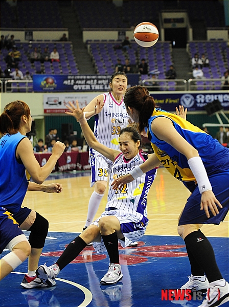 【부천=뉴시스】김인철 기자 = 14일 오후 경기 부천실내체육관에서 열린 신세계·이마트 2011-2012 여자프로농구 부천 신세계 쿨캣과 안산 신한은행 에스버드 경기에서 신세계 박은진이 패스 도중 넘어지고 있다.