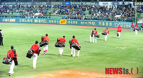 【대구=뉴시스】전신 기자 = 25일 오후 대구시민야구장에서 2011 롯데카드 프로야구 한국시리즈 1차전 삼성라이온즈와 SK와이번스의 경기가 열렸다. 2-0으로 패배한 SK 선수들이 경기를 마친 후 경기장을 빠져나가고 있다.