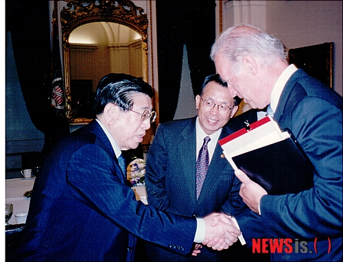 【서울=뉴시스】김운용 전 IOC 부위원장이 2001년 바이든 미국 상원의원과 만나 악수를 나누고 있다.