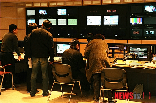 【서울=뉴시스】김영욱 기자 = 15일 오후 중앙일보가 출자해 올해 12월1일 개국예정인 종합편성채널 JTBC의 개국편성 설명회가 서울 중구 순화동 중앙일보 사옥에서 진행된 직후 견학을 위해 열린 부조정실에서 관계자들이 영상을 점검하고 있다.