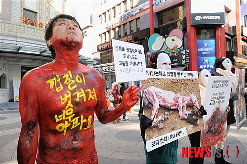 【서울=뉴시스】김영욱 기자 = 20일 오후 서울 중구 명동예술극장앞에서 한국동물보호연합 소속 회원들이 모피 반대 남성 누드 퍼포먼스를 하고 있다. 모피반대는 최근 서울 세빛둥둥섬에서 진행된 모피 패션쇼와 가수 이효리씨 모피 반대 발언으로 인해 다시 한번 주목받고 있다.