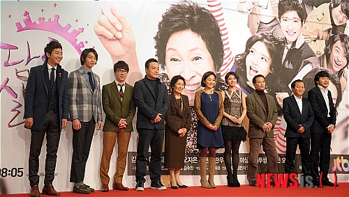 【서울=뉴시스】박동욱 기자 = 25일 오후 서울 중구 중앙일보 본사 J1스튜디오에서 열린 JTBC 일일시트콤 '청담동 살아요' 제작발표회에 참석한 출연진이 포즈를 취하고 있다. 왼쪽부터 배우 이상엽, 현우, 가수 조관우, 김석윤 감독, 배우 김혜자, 이보희, 오지은, 오상훈, 우현, 최무성.