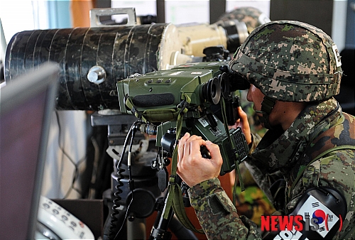 【연천=뉴시스】국회사진기자단 = 김정일 사망후 군부대가 비상 근무 태세에 돌입한 가운데 21일 경기도 연천 육군 태풍부대 전방 관측소에서 관측병이 북한지역의 움직임을 살펴보고 있다.