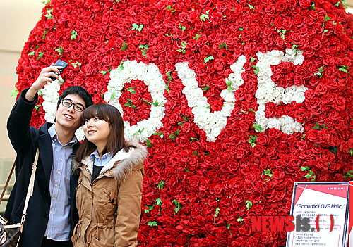 【서울=뉴시스】서재훈 기자 = 발렌타인데이를 이틀 앞둔 12일 롯데몰 김포공항을 찾은 한 커플이 장미로 가득 채운 대형 하트 포토 존에서 사진 촬영을 하고 있다. 포토존 및 초콜렛 아트 작품전시는 다음달 15일까지 롯데몰 김포공항 MF층 매장 앞에서 진행된다. (사진=롯데몰 제공)