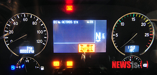 【고양=뉴시스】박동욱 기자 = 상용차 그룹 다임러 AG사의 자회사이며 국내 수입 트랙터사인 다임러 트럭 코리아가 20일 오전 경기 고양 킨텍스 제2전시장에서 메르세데스 벤츠의 프리미엄 대형 트럭 '악트로스 리미티드 에디션 블랙 라이너(Actros Limited Edition Black Liner)' 출시 행사를 개최했다. 악트로스 리미티드 에디션 블랙 라이너는 배기량 15,928cc의 550hp(1,800rpm) V8 Euro 5 Bluetec 엔진에 향상된 메르세데스 파워시프트 2(MPS 2) 자동변속기가 장착되어 최대 토크 265.3km·m(1,080rpm)을 발휘한다. 사진은 차량의 계기판 모습.