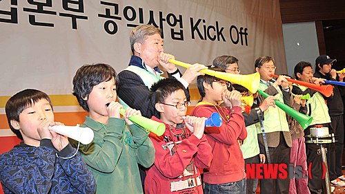 【서울=뉴시스】임영주 기자 = 서울 충무로 포스트타워 서울중앙우체국 대회의실에서 21일 열린 우정사업본부 공익사업 킥오프 행사가 열렸다. 관계자들과 어린이들이 사랑과 나눔이 세상에 널리 퍼지기를 바라며 사랑, 나눔, 희망의 나팔을 불고 있다.