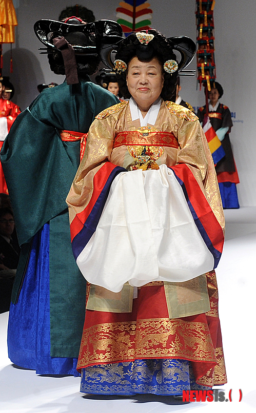 【서울=뉴시스】조성봉 기자 = 5일 오후 서울 용산구 국립중앙박물관에서 열린 '조선의 혼 다시 살아나다' 한복패션쇼에서 모델로 나선 배우 강부자가 포즈를 취하고 있다. 이번 행사는 대통령직속 국가브랜드위원회 주최로 조선왕실의궤의 내용을 재현하기 위해 열렸다.