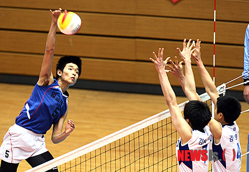 【제천=뉴시스】전진환 기자 = 20일 충북 제천 실내체육관에서 열린 2012 춘계 전국 남녀 중고연맹전 고등부 8강전 남성고-벌교제일고 경기에서 남성고 김윤호와 김형진이 벌교제일고 구교준의 공격을 블로킹하고 있다. (사진=스포츠포커스 제공)