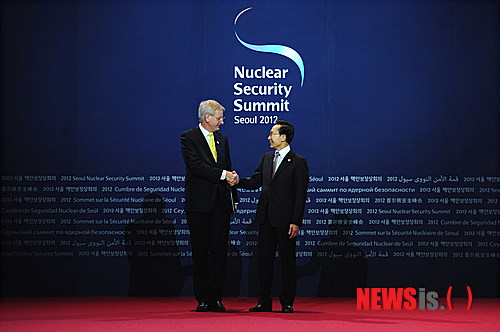 【서울=뉴시스】박태홍 기자 = 이명박 대통령이 26일 오후 서울 강남구 삼성동 코엑스에서 열린 '2012 서울 핵안보정상회의' 공식환영행사에서 스웨덴 칼 빌트 외교장관과 악수하고 있다.(사진=청와대 제공)