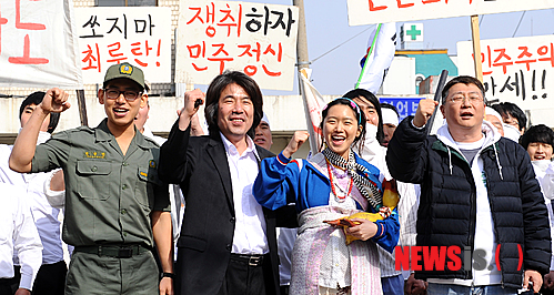 【서울=뉴시스】조종원 기자 = 1일 오후 서울 금천구 독산동축산물도매시장에서 열린 영화 '미운 오리 새끼' 크랭크업 현장공개에서 배우 김준구, 오달수, 정예진, 곽경택 감독을 비롯한 출연배우들이 기념촬영을 하고 있다.