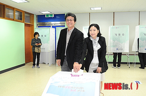 【부천=뉴시스】정일형 기자 = 제19대 국회의원선거일인 11일 오전 김만수 경기 부천시장과 부인 현은희 여사가 범박주민자치센터에서 투표를 하고 있다.