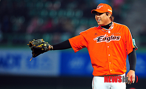 【인천=뉴시스】김인철 기자 = 13일 오후 인천 문학야구장에서 열린 2012 팔도 프로야구 SK 와이번스와 한화 이글스의 경기에서 7회말 SK 공격 1사 상황 SK 김강민이 땅볼아웃되자 한화 류현진이 미소 짓고 있다.