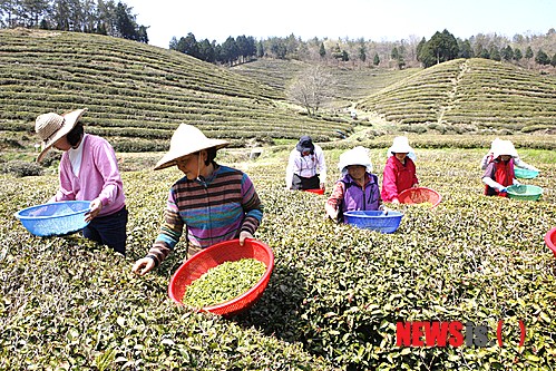 【보성=뉴시스】구용희 기자 = 따사로운 봄 햇살 아래 녹차수도 전남 보성군 회천면 화동마을 한 다원에서는 20일 곡우(穀雨)를 앞두고 올해 첫 녹차 새순을 따는 작업이 한창이다. 곡우를 전후해서 돋아난 어린 순만을 골라 만든 우전차는 촉감이 부드럽고 향과 맛이 좋으며 생산량이 많지 않아 최상품 녹차로 판매된다. 사진은 지난 17일 보성군 회천면 화동마을에서 찻잎 따는 농민들의 모습. (사진= 전남 보성군 제공)