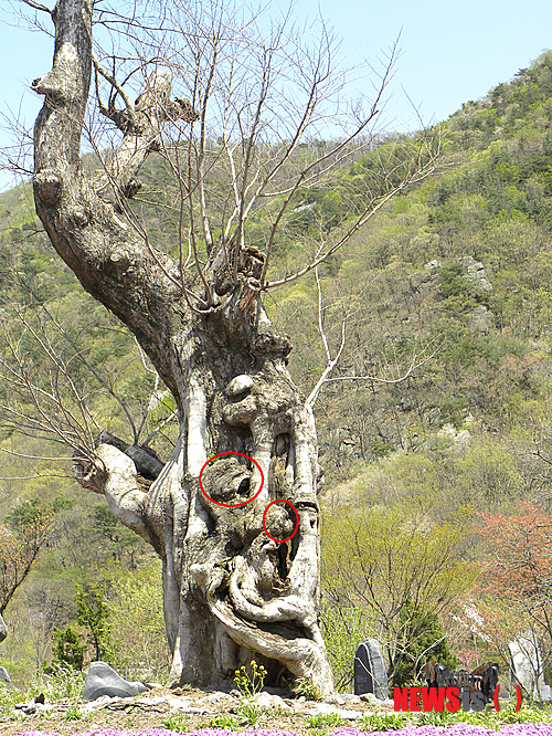 【보령=뉴시스】이진영 기자 = 27일 충남 보령시 성주면 성주리 성주개화예술공원에 버젖이 서 있는 수령 800~1000년 된 개서어나무 중간에 두마리 원숭이 머리형태(붉은 원형)를 나타내고 있어 눈길을 끌고 있다.이 개서어나무는 계화예술공원측이 지난 2009년 경남 산청에서 500만원에 구입해 식재했으며 나뭇잎은 5월 중순부터 자라기 시작한다.