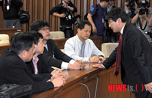 【서울=뉴시스】김영욱 기자 = 30일 오전 서울 여의도 국회에서 열릴 예정이던 문화체육관광방송통신위원회 전체회의가 전재희 위원장을 비롯한 새누리당의 불참으로 개회되지 않은 가운데 김재윤 민주통합당 간사가 안건을 위해 출석한 방송3사 전국언론노조위원장과 의견을 나누고 있다. 왼쪽부터 YTN 김종욱, KBS 김현석, MBC 정영하 언론노조위원장, KBS 남철우 새노조 홍보국장.