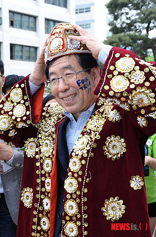 【서울=뉴시스】김기태 기자 = 박원순 시장이 12일 서울시청 서소문청사 다산플라자에서 열린 ‘2012년 세계 공정무역의 날, 한국 페스티벌' 개막식에서 방글라데시 의상을 입고 있다. (사진=서울시 제공)