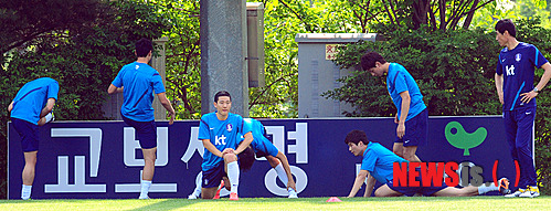 【파주=뉴시스】전신 기자 = 21일 오후 파주NFC(국가대표 트레이닝센터)에서 축구 국가대표 선수들이 운동장을 뛴 후 몸을 풀고 있다. 축구 국가대표팀은 스페인과 평가전(31일), 카타르, 레바논과의 2014년 브라질월드컵 아시아 최종예선(6월8일·12일)을 앞두고 있다.