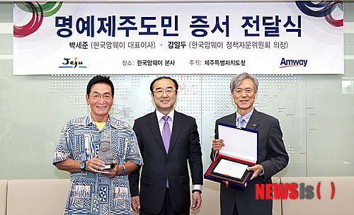 【서울=뉴시스】박상권 기자 = 박세준 한국암웨이는 대표이사와 사업자 대표인 김일두 정책자문위원회 의장이 명예 제주도민으로 위촉, 11일 제주특별자치도로부터 명예도민증과 인증패를 수여받았다.