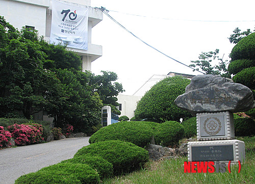 【목포=뉴시스】박상수 기자 = 전남 목포시의 마지막 향토기업 행남자기㈜가 최근 상동 목포공장 부지를 매각하면서 타지역 이전이 검토되고 있다. 12일 도자기를 상징하는 '흙과 불의 예술'이란 글귀가 새겨진 창립 50주년 기념비가 상동 공장 입구에 세워져 있다.