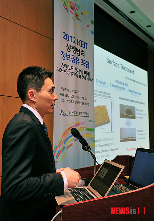 【서울=뉴시스】29일 한국산업기술평가관리원(원장 이기섭)이 주최한 R&D상생협력 정보공유포럼에서 미국 피츠버그대학교 천영재 교수가 혈관질환관련 기기 개발 내용을 발표하고 있다. (사진=한국산업기술평가관리원 제공)